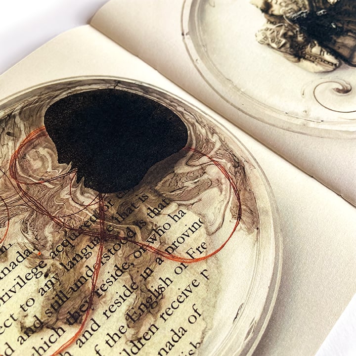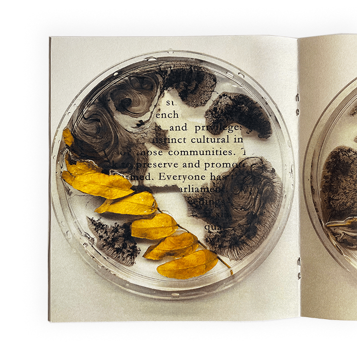28 pages colour, 16.5 x 14 cm. These pieces were constructed in petri dishes using water, india ink, found objects, and fragments torn from the Canadian Charter of Rights and Freedoms. Published by Paper View Books (Portugal). Part of the Odd Pages collection.
