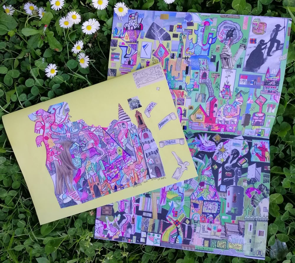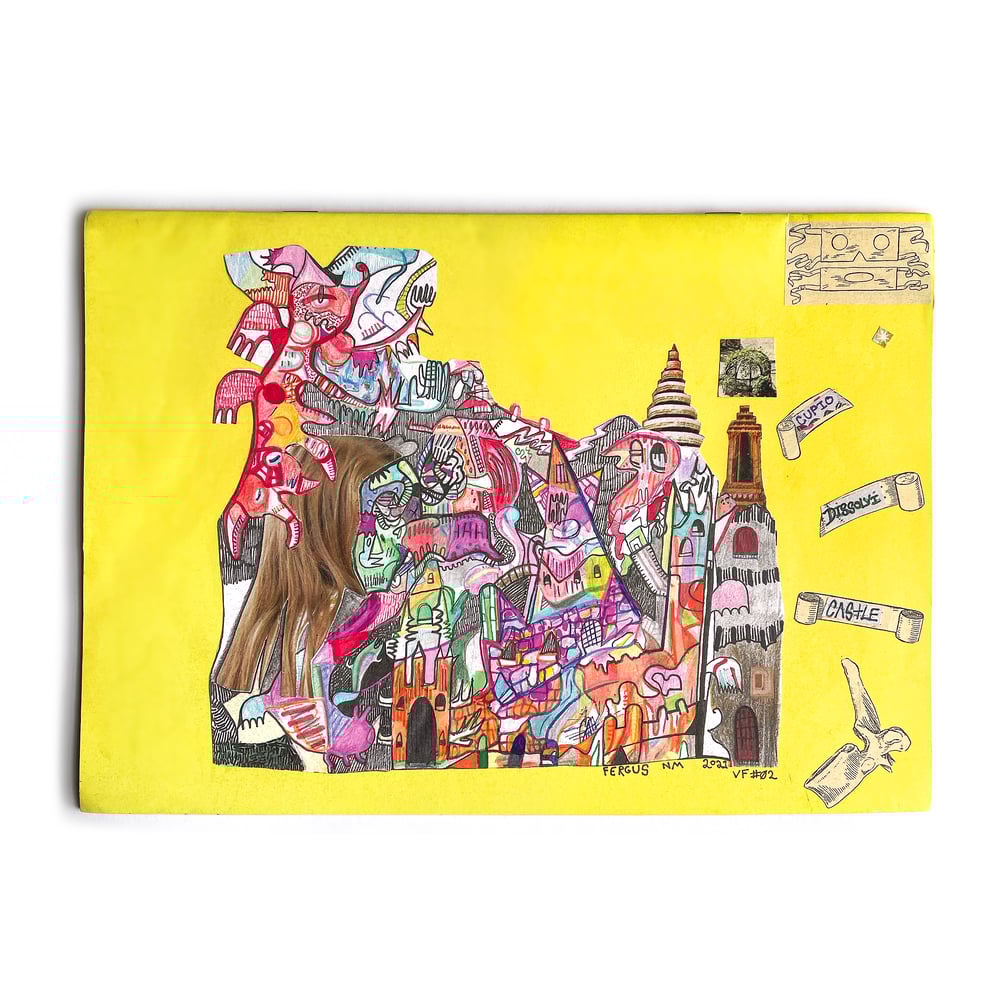 CUPIO DISSOLVI CASTLE is an exploration of dream architecture seen through the lens of Messyism, a joyous meeting of sharpie saturations and fantastically fractured collage. Tired travelers, fatigued pilgrims, dream-burnt youth - they all seek intangible places, strange citadels. CUPIO DISSOLVI CASTLE is the greatest Imaginary Palace of them all.