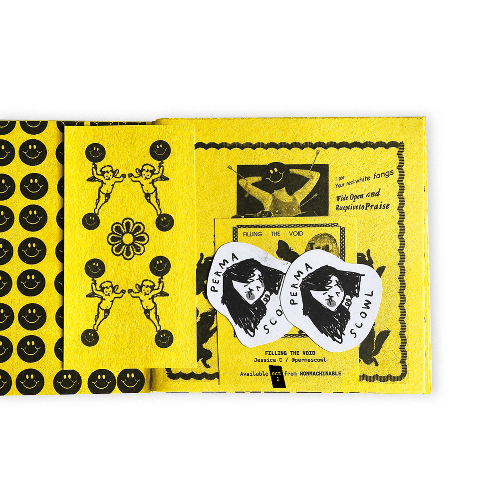 Jessica C—@permascowl on Instagram—is a multimedia artist specializing in works on paper. She collects books, magazines, tickets, thread, cards, stickers, and other ephemera, all of which informs her work here. "I see everything I make as part of a story," Jessica writes, "and it's one that's being put together." FILLING THE VOID serves as an unforgettable tour through a few immaculately assembled portions of this storyworld.
