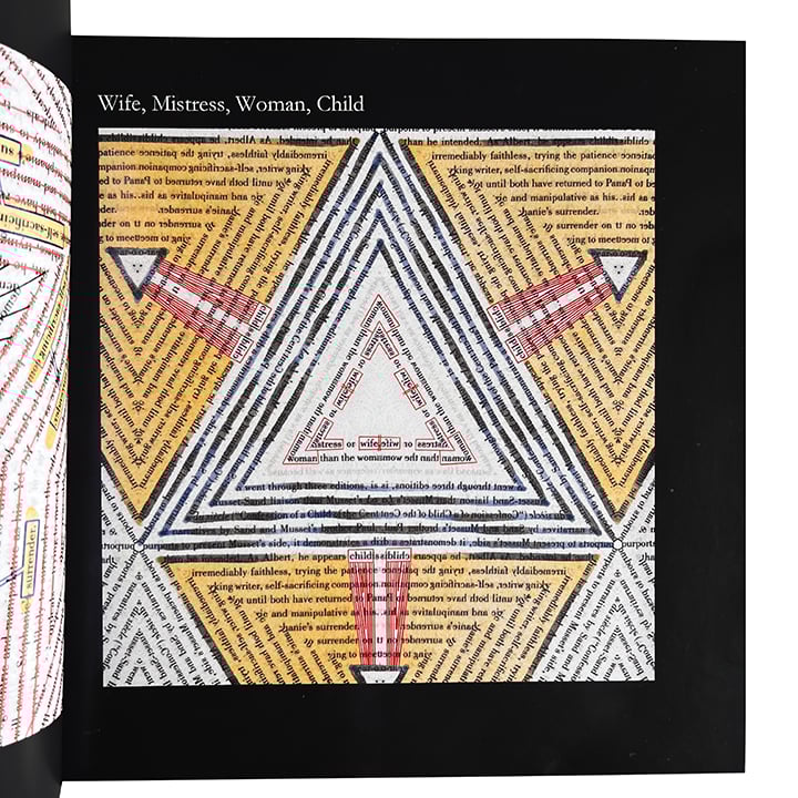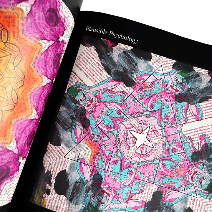 In these intricately made, vibrant collages, ReVerse Butcher uses a variety of materials and tools from glue and scissors to VR and 3-D modelling software. Through her own invention, the kaleidoscopic erasure, rVb toys with perceived realities, linearity, gender, religion and possibly even time itself. There’s a tension between geometric precision and disrupted message; between the treatment of text as an authority one should obey to rVb’s playful cut-ups, distortions, drawings and red-lining. Words are presented forwards, backwards, upside down and sideways. They merge with each other and split apart to disorient the reader, to make the reader take a closer look. Visual poems can be viewed all at once by the eye, then taken in by the brain. You can scroll through and adore the vibrancy, getting a gander at individual isolated words such as “immoral” or “powerful.” Or you can view through the kaleidoscope and see the words move and dance, join and separate. This is kinetic and original work. - Amanda Earl, editor of Judith Women Making Visual Poetry (Timglaset Editions, 2021)