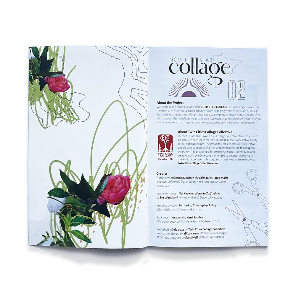 The second issue of Twin Cities Collage Collective's publication highlighting Minnesota-based collage and mixed media is now available! NORTH STAR COLLAGE #2 is nearly three times the size of the first issue, representing 75 artists in Minnesota who are currently working with the technique. This publication features a wide variety of techniques and styles, ranging from cut-and-paste to digital compositions to mixed media.