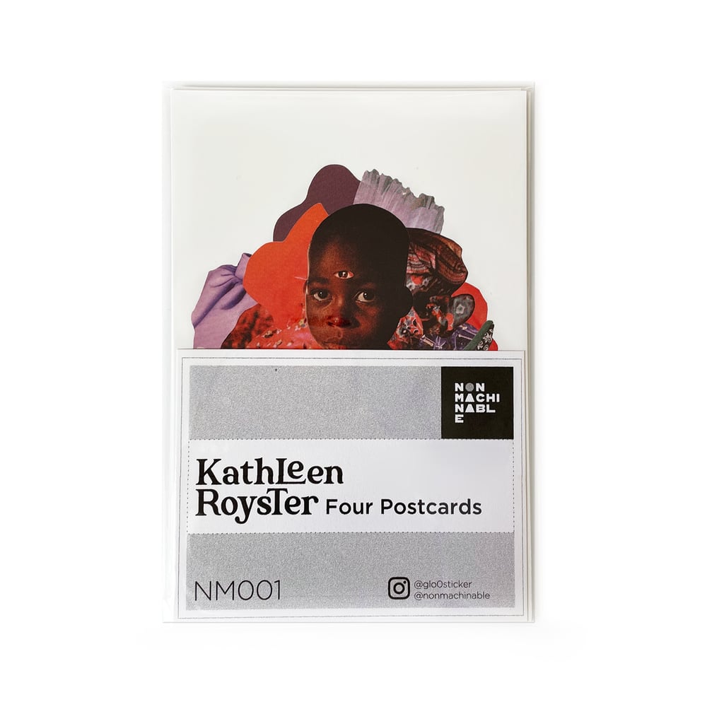 Four full-color postcards by artist Kathleen Royster (@glo0sticker) printed on luxurious 110lb.-weight paper with a satin finish. Each postcard measures 4 x 6 inches. Includes four different designs. Edition of 100. Free U.S. shipping. Catalogue number: Nonmachinable Editions 001. **Now in stock!